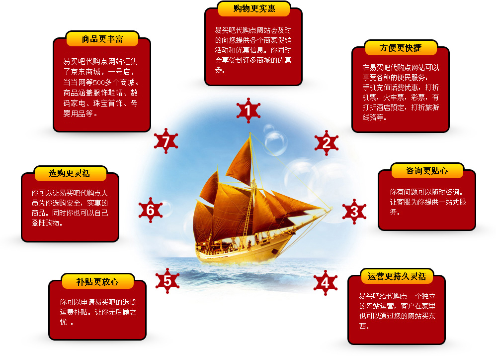 易买吧电商服务店是民环科技(北京)有限公司于2010年8月推出的国内第三方全民网购的项目,易买吧电商服务店汇聚了包括当当、苏宁易购等国内知名的网上商城,为消费者提供咨询和代购服务,让消费者都能享受到网购带来的实惠。